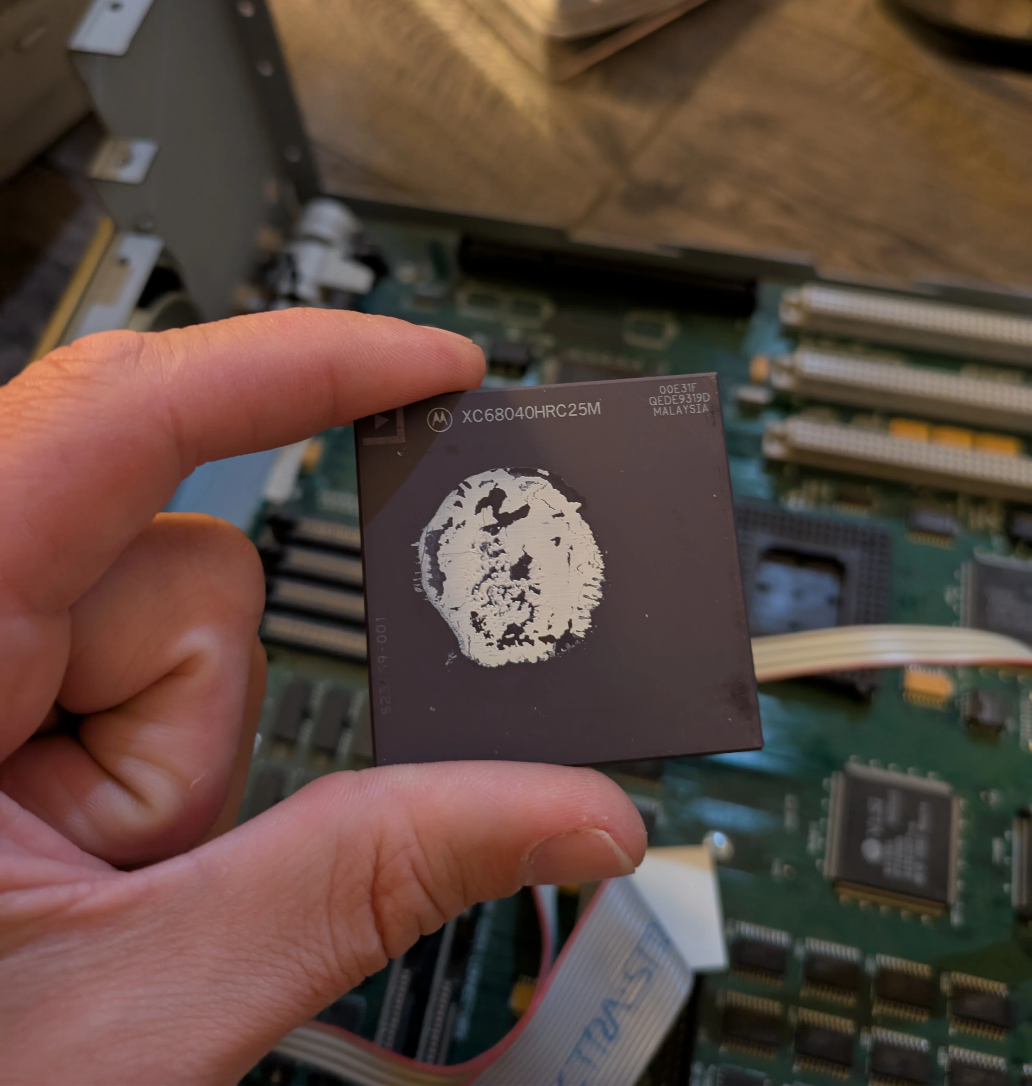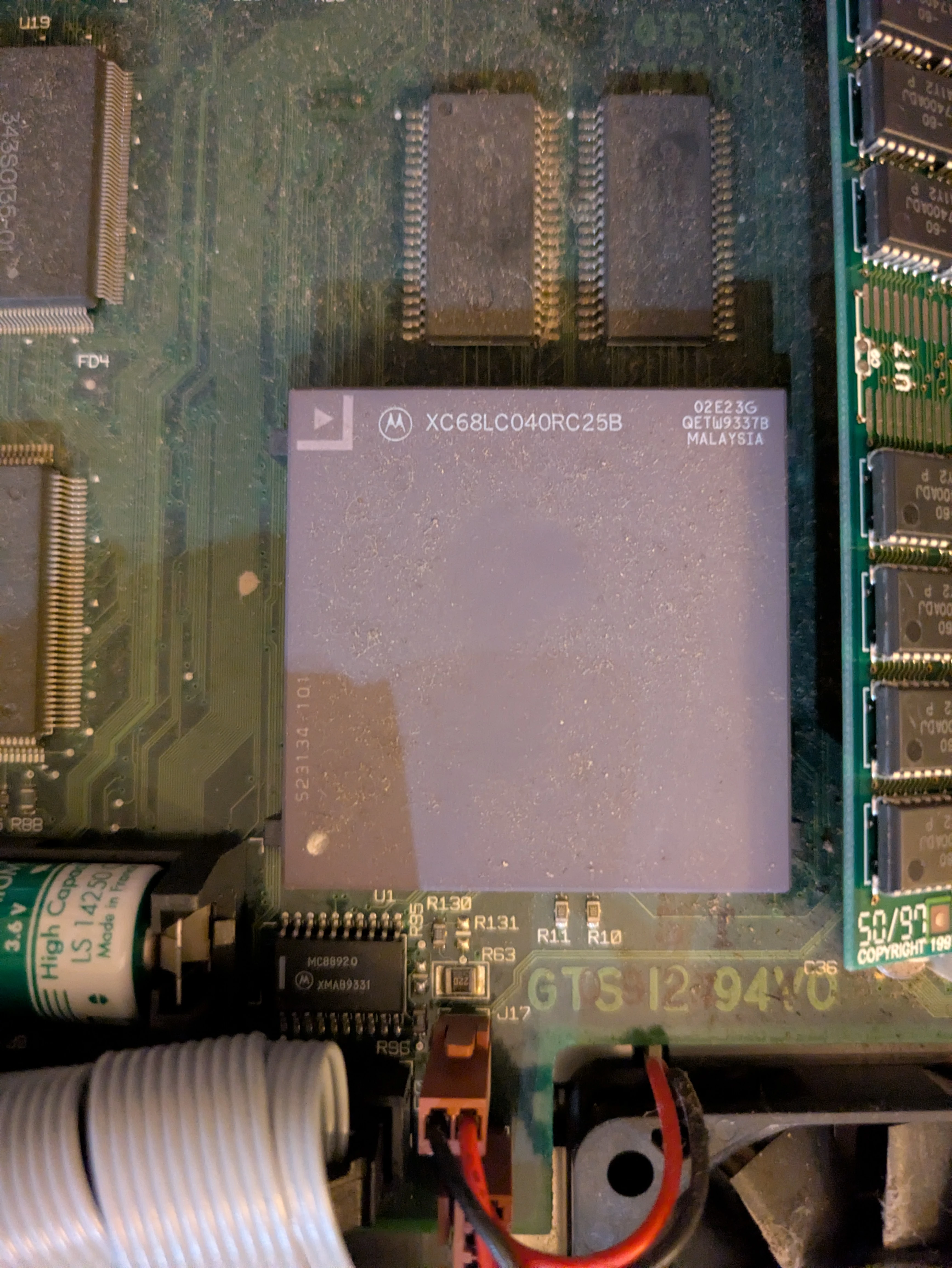The Performa 475 comes with a 68LC040 CPU. The LC stands for "Low Cost", and excludes the FPU. I decided to swap it out for a full fledged 68040 with the FPU.