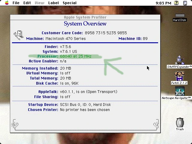 After a jump-start boot (I was short on 1/2 AA lithium batteries), it booted up to System 7.1P3 on the original HDD, which seems to have benefited from being spun back up for the imaging process. Hooray!