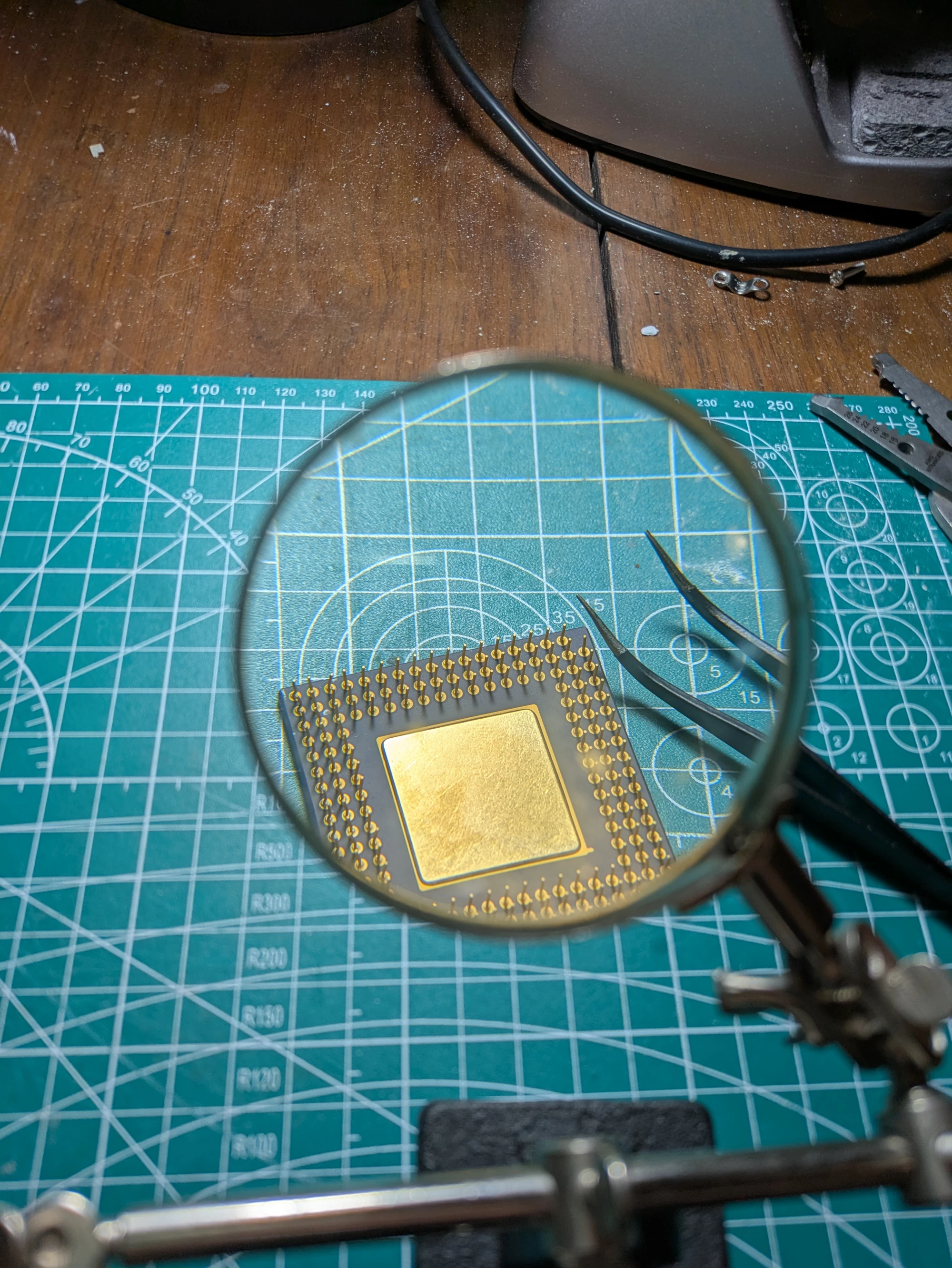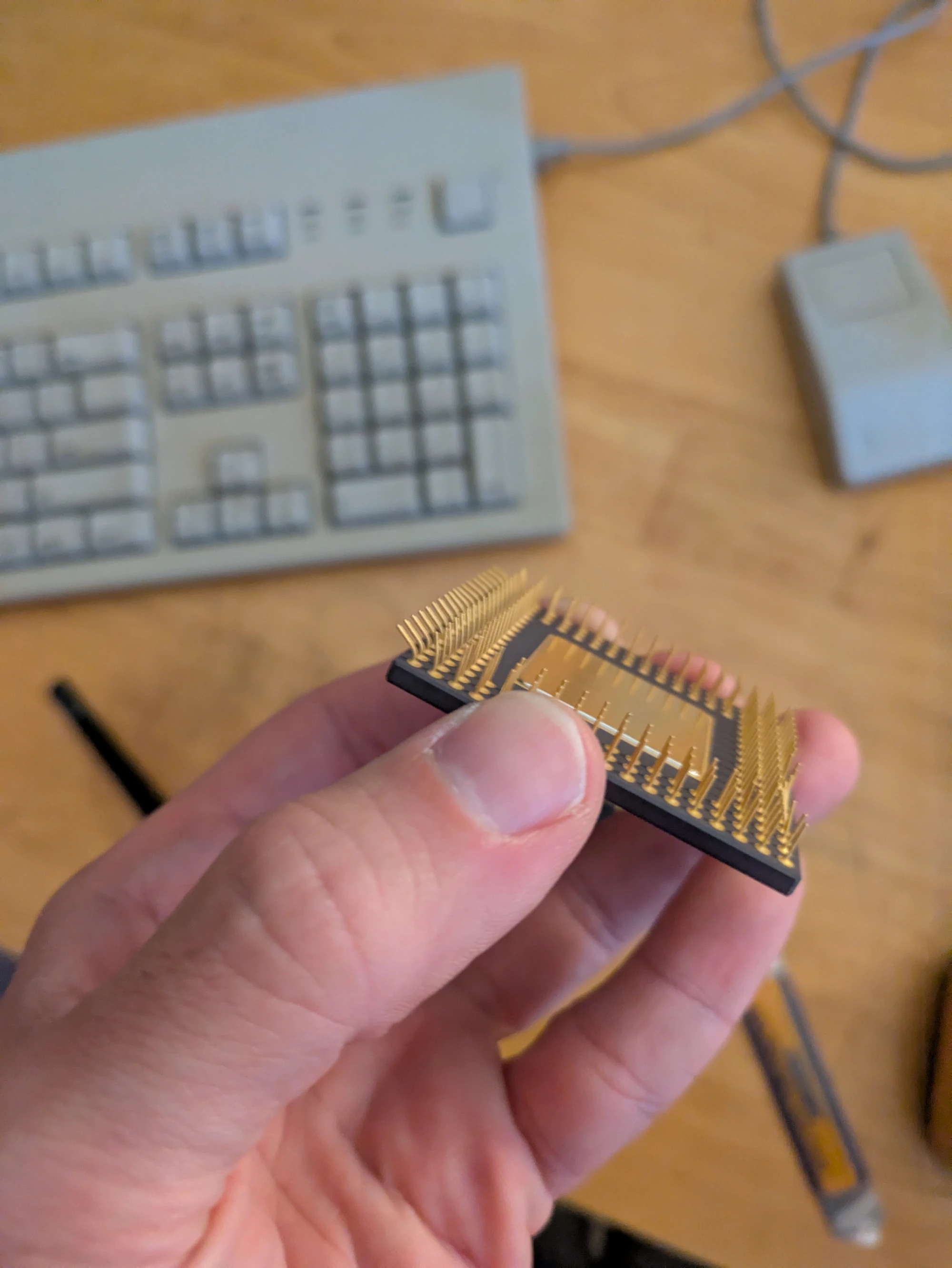 I am an ape-handed buffon and I bent the heck out of the pins of the 68LC040 when removing it from the Performa. I was planning on sticking it into the Centris I stole the 68040 from, so I had better fix that.