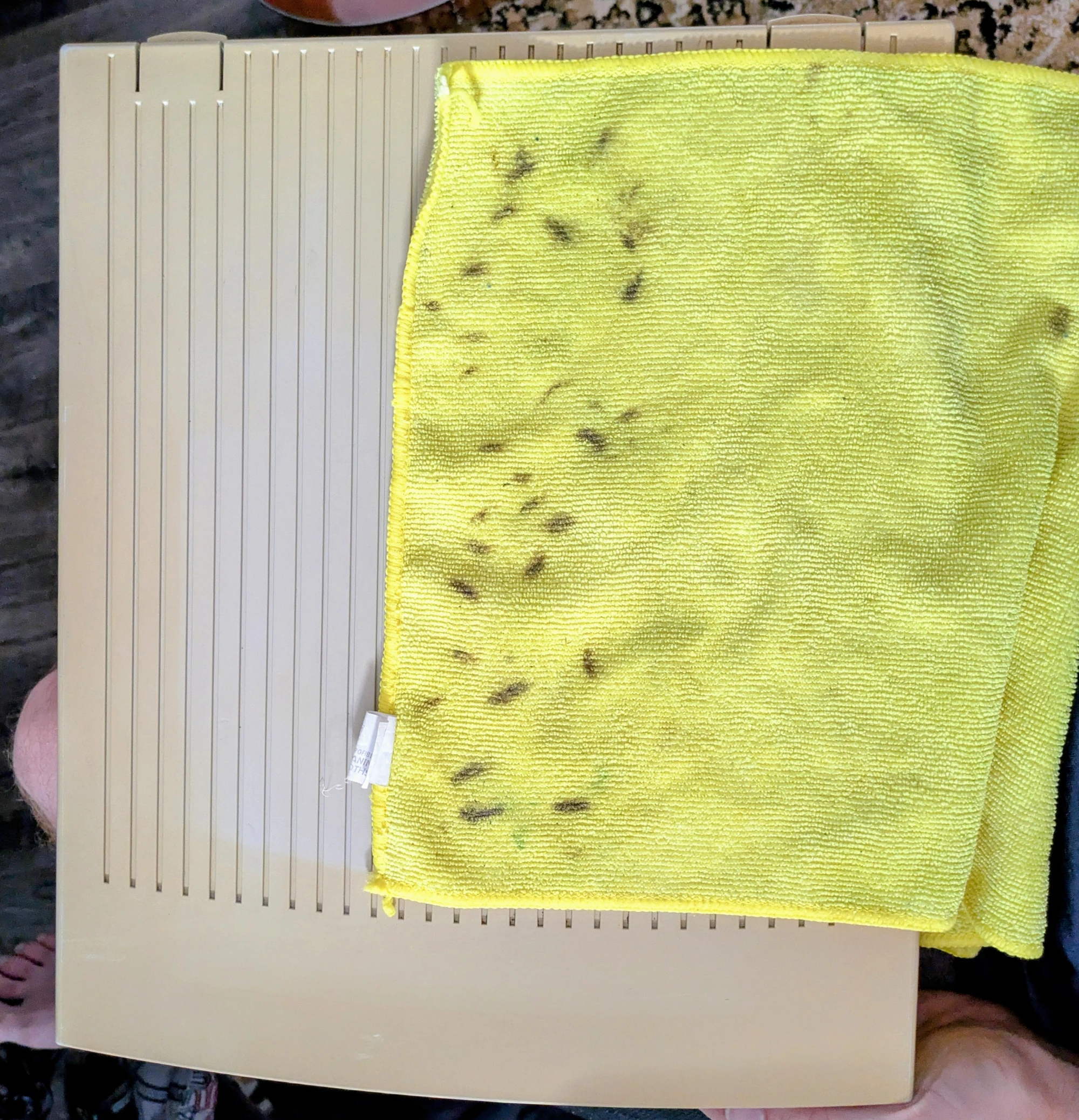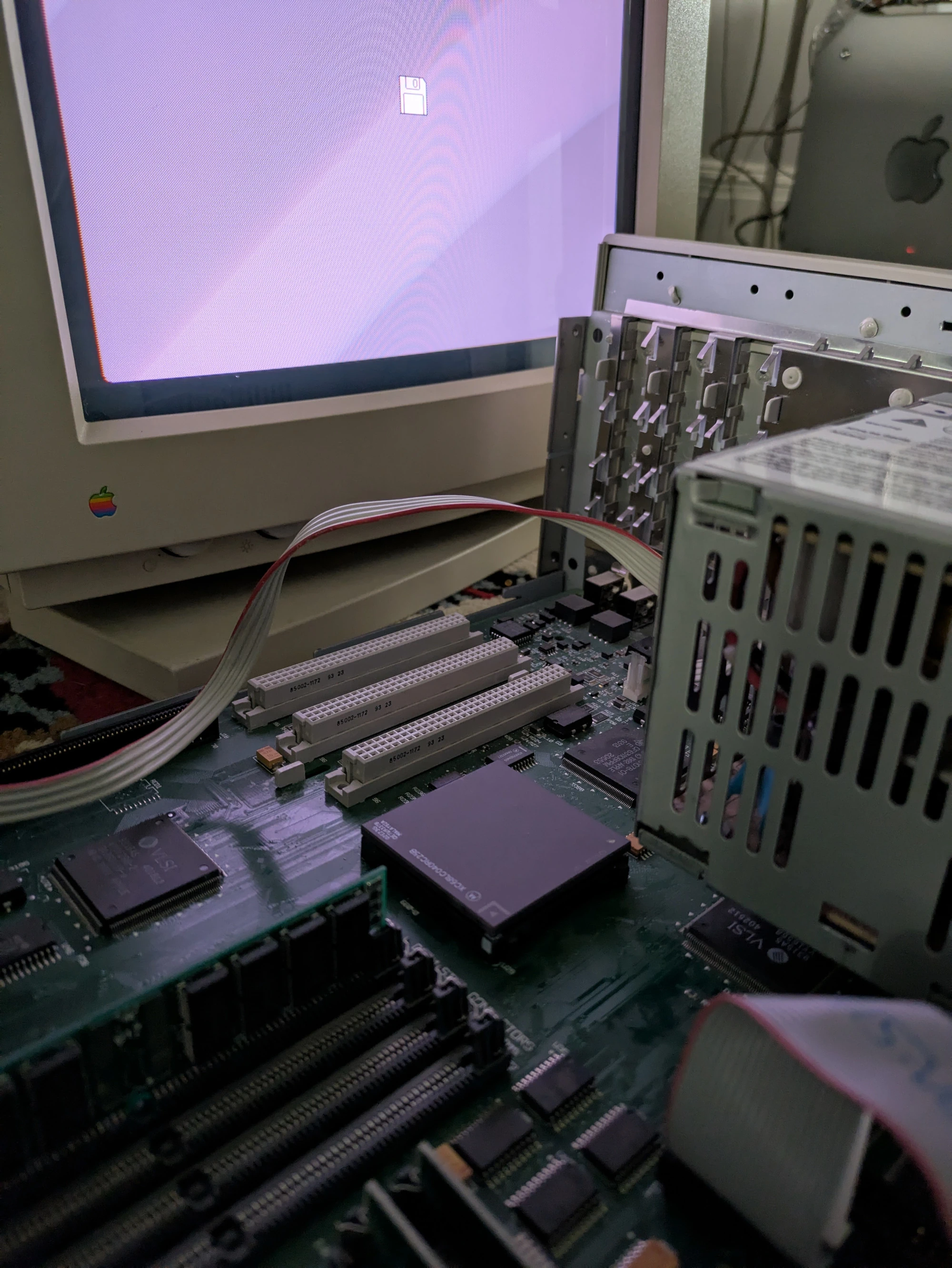 To see if this thing would actually boot, I swapped in two VRAM sticks (both 256 KB, I think) from the HPV card in my Power Mac 7100. I took a moment to clean the top cover, including scrubbing the accumulated scum from the grooves. Gross.