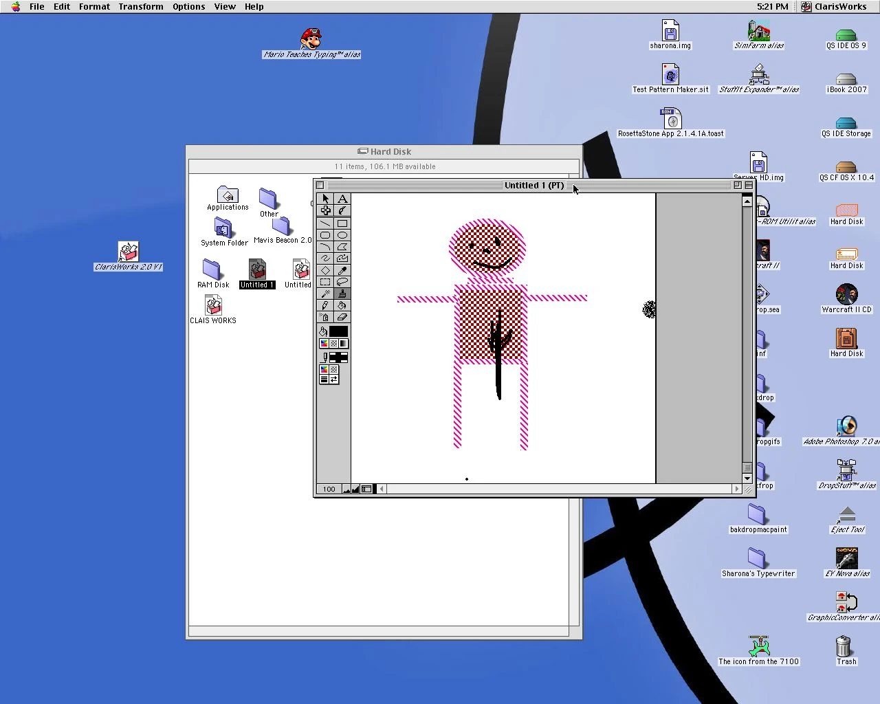 After a successful image, I poked around the files. It was nearly stock, but there were a few ClarisWorks files. The only notable one was this doodle. I... yeah.