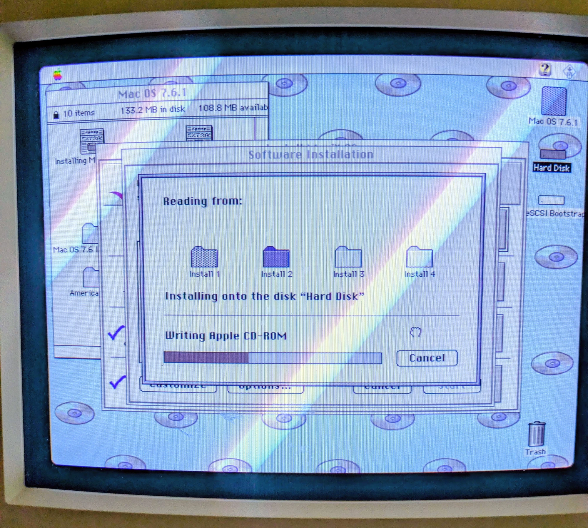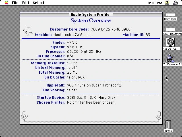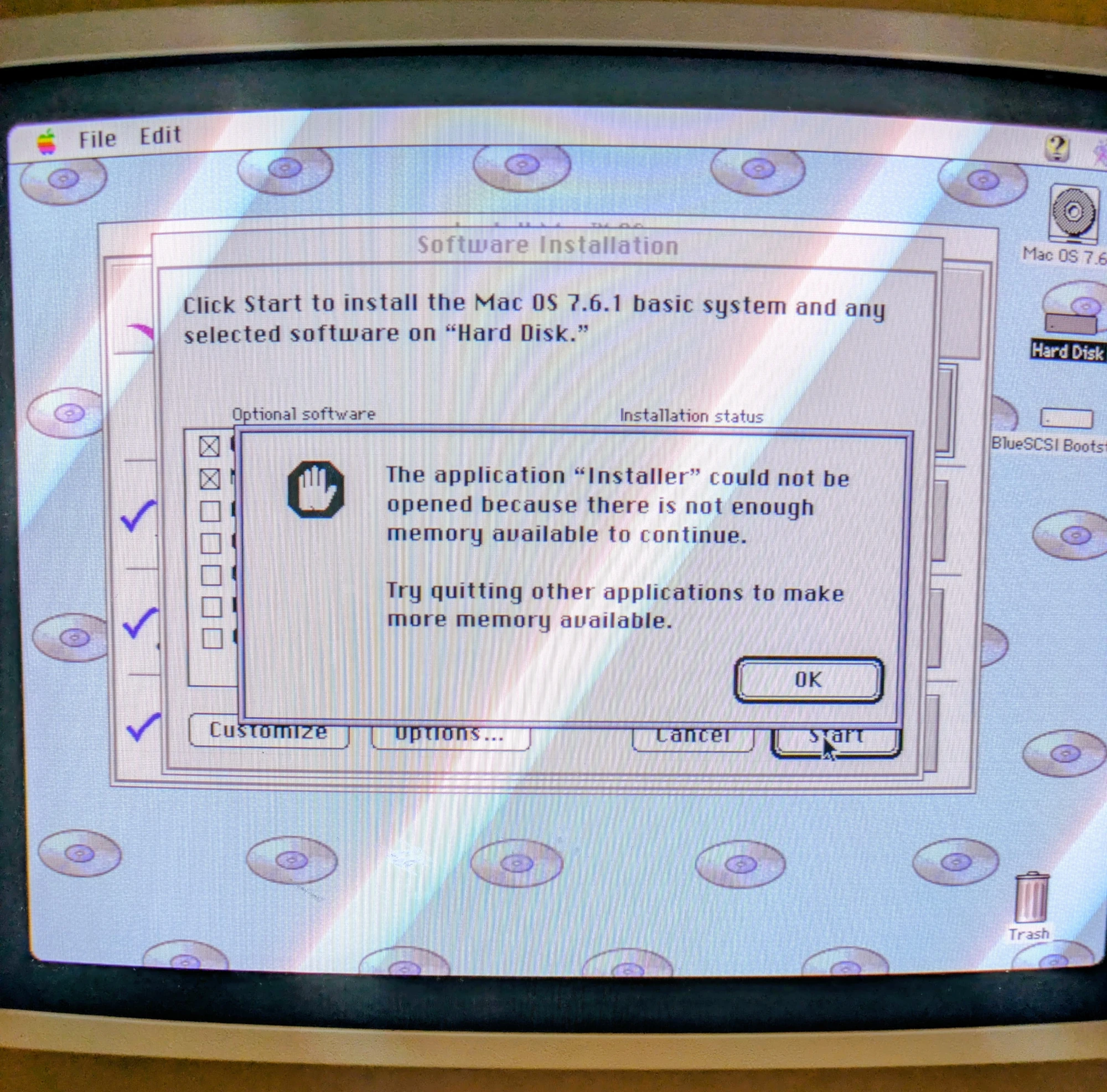 After a lot of futzing around with a BlueSCSI (this Performa is a little picky), I got a 7.6 CD image to boot. So let's install-- oh, nevermind. The paltry built-in 4MB of RAM isn't even enough to launch the installer.