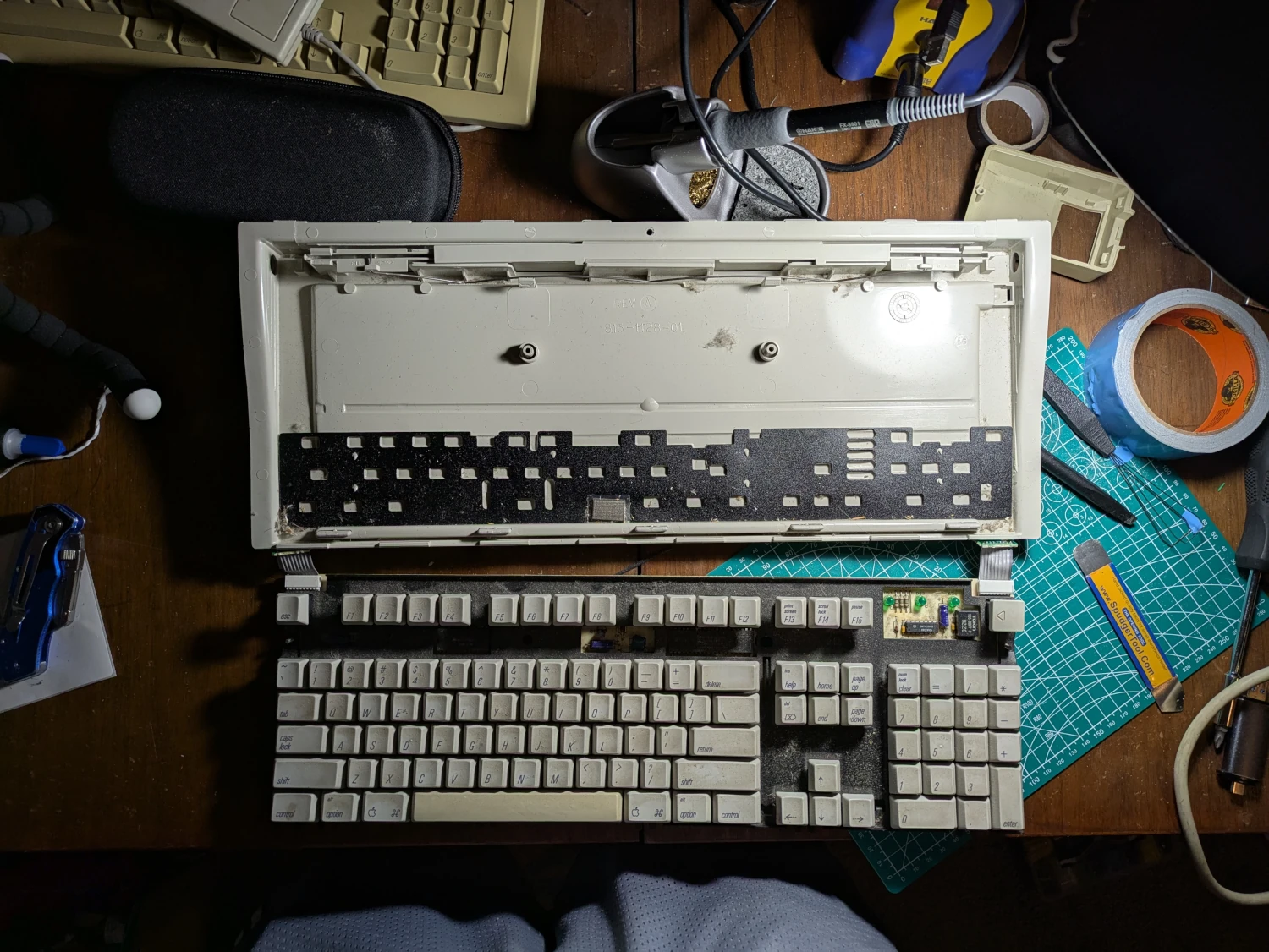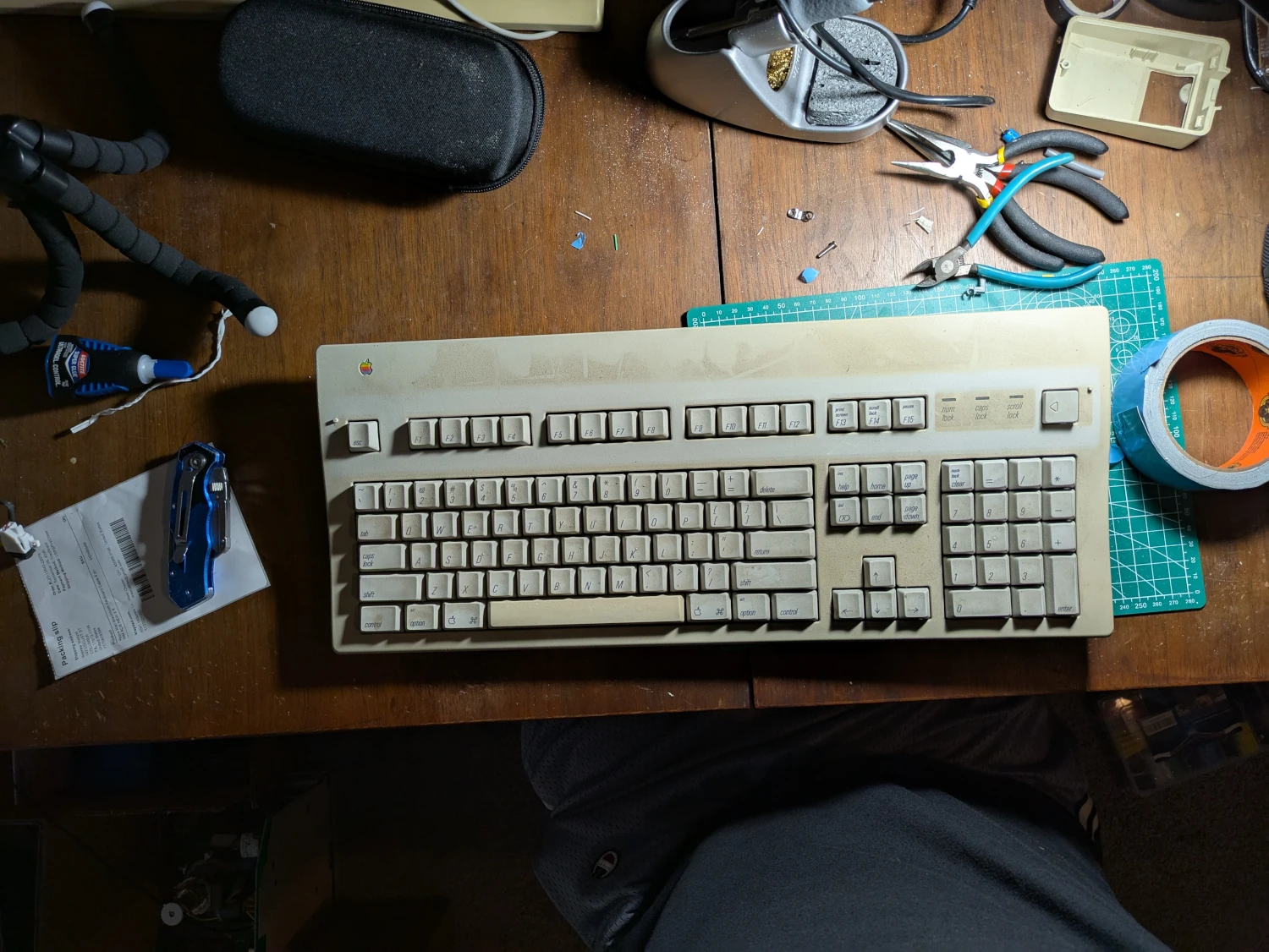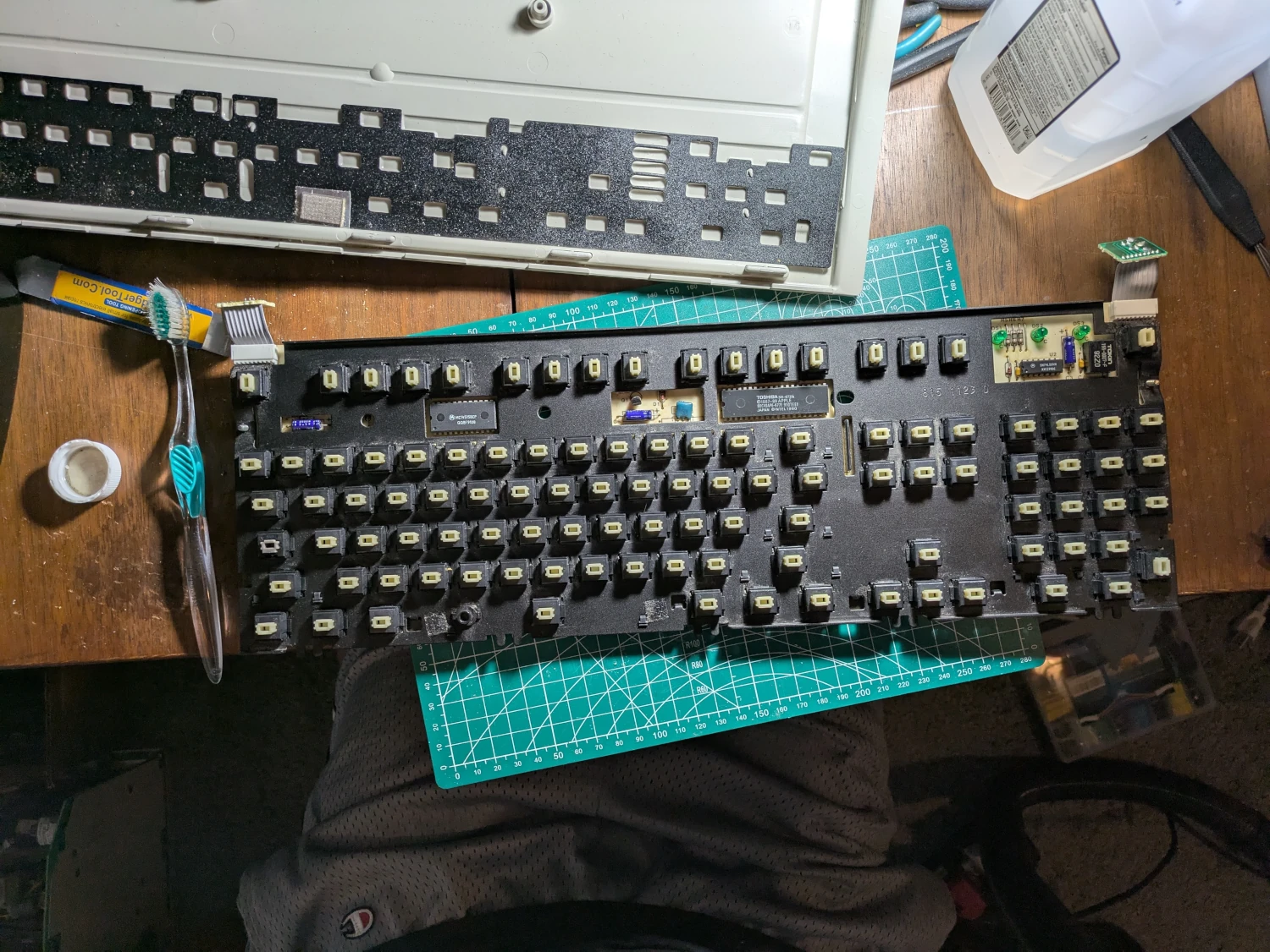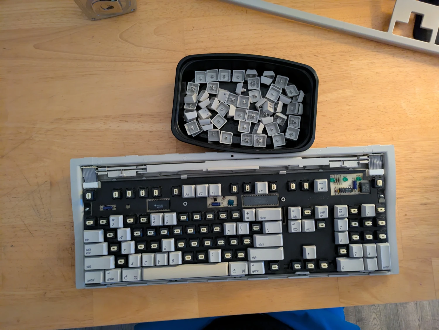One screw removed and some plastic tabs pushed in, and I was in. This ifixit guide came in clutch here. It wasn't too horrendus inside (my m0110 keyboard was full of dead yellowjackets, for a comparison), but this one had plenty of dust bunnies and animal hair to vacuum out.