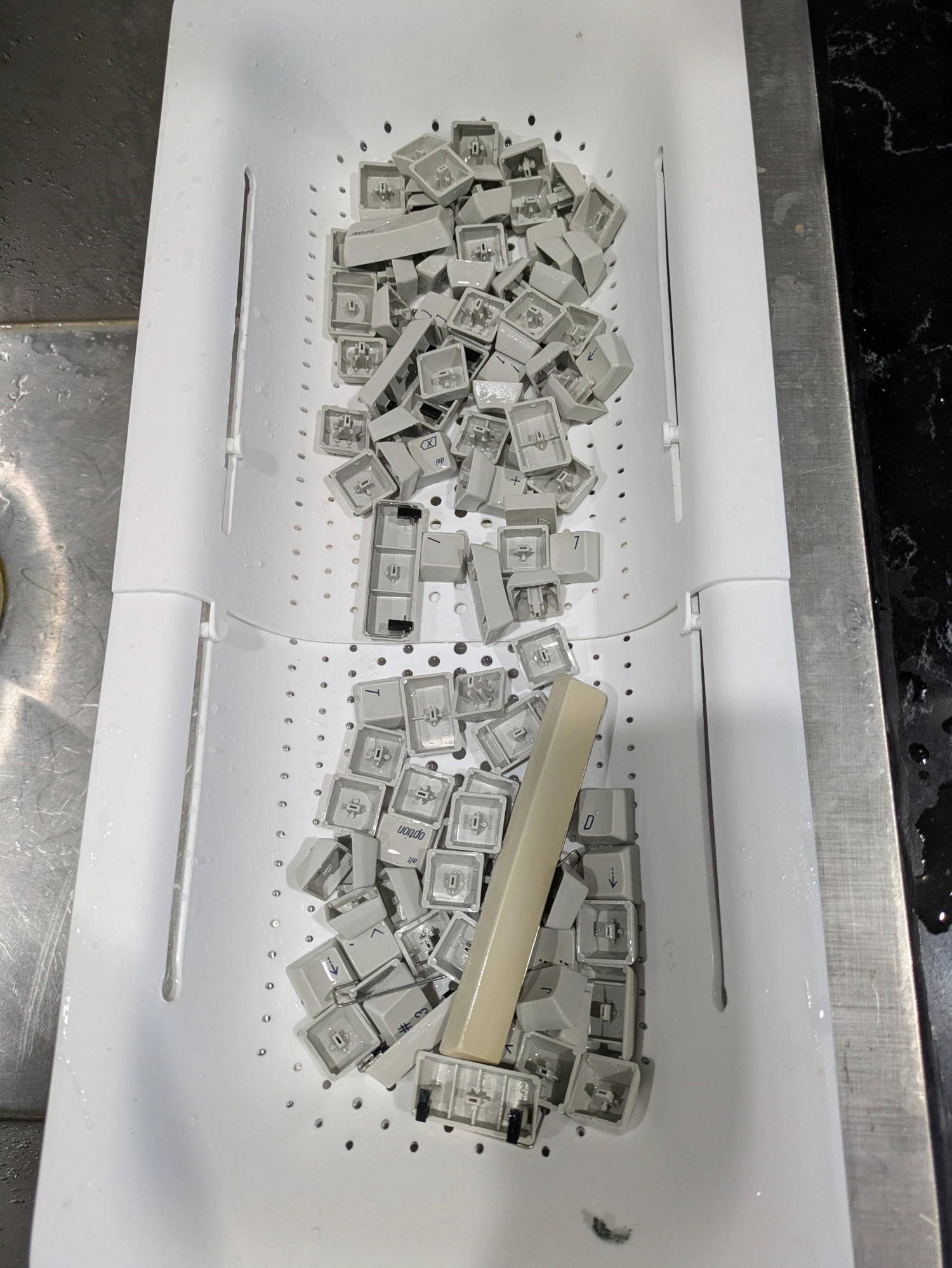 All the keys, along with both halves of the case, got a bath of soap and water in the kitchen sink. What is it with spacebar keys being the only ones that get yellow?