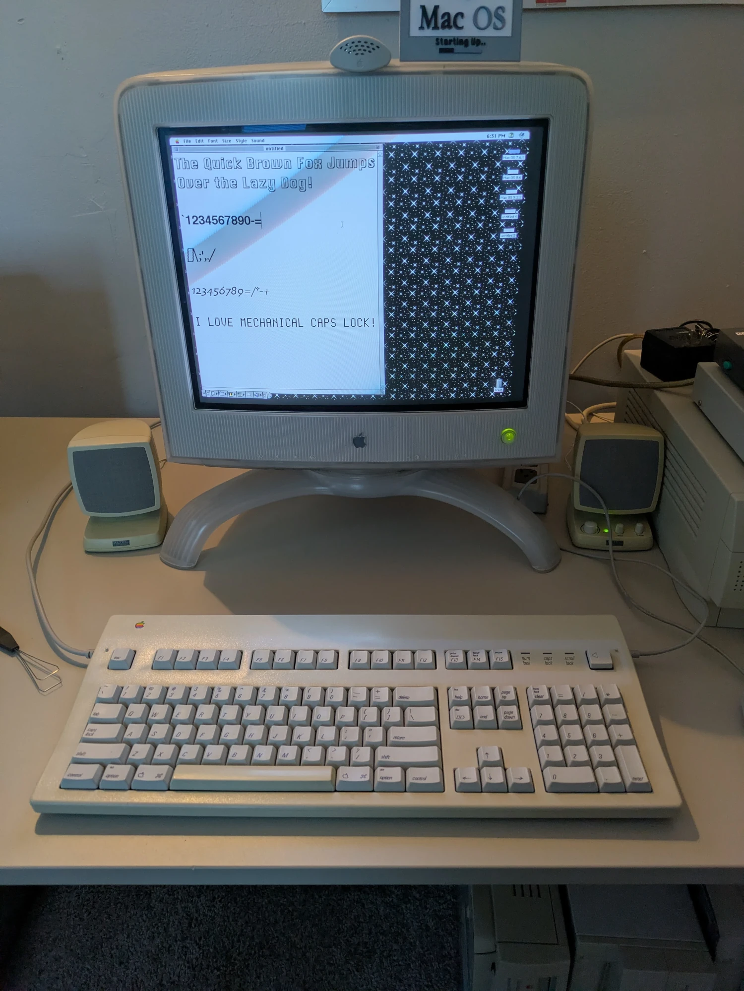 Back together and tested on my Power Mac 7600. Everything works, and it looks nice and clean. Definitely has a bit of sunburn, with tan lines where a function key template certainly lived. I'm not a personal fan of the Retro Bright look, so this to me looks fine enough.