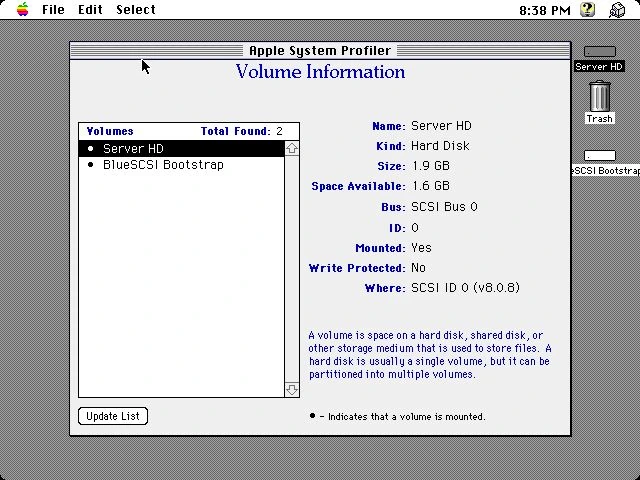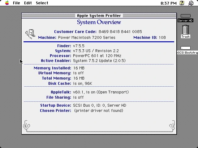...and a whopping 2GB SCSI HDD running running System 7.5.3. The 2GB HDD was the higher-end choice; the cheaper default was 1.2GB.